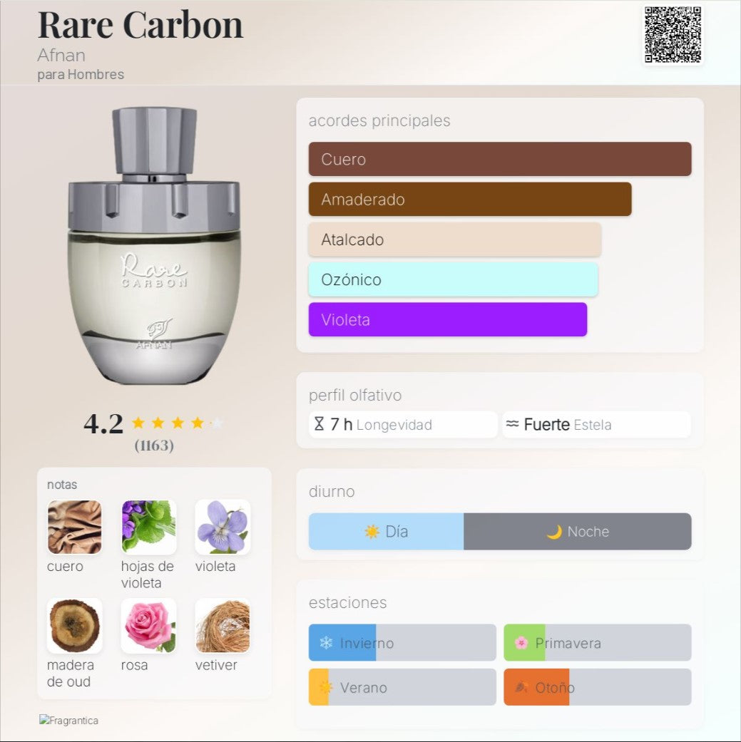 Afnan Rare Carbon Eau de Parfum 100 ml es una fragancia masculina intensa, sofisticada y cargada de carácter, concebida para hombres que buscan una firma aromática profunda, elegante y con presencia.